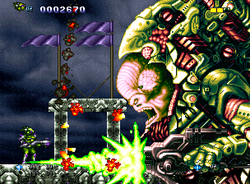 Gunlord is a run and gun game reminiscent of Turrican where players assume the role of Gordian Gaiden across nine non-linear stages set in the planet Kairos II.[1] Its plot takes place after the events of Last Hope, where the evil empire was destroyed by pilot Vanessa Gaiden and although she escaped, her victory was short-lived as she never made it home and was declared missing in action. Meanwhile, a new evil appeared and began to terrorize the galaxy, a planet lord called "The Master" that can create beings of steel and enslave humans by absorbing their souls. Gordian, Vanessa's newlywed husband, is out to search for her when he feels the presence of evil and dons his Gunlord suit.[1][2]
