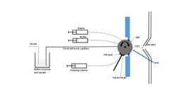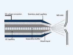With the sheath-flow interface, the electrical connection between an electrode and background electrolyte is established when the CE separation liquid is mixed with sheath liquid flowing coaxially in a metal capillary tubing. In most popular commercial CE-ESI-MS interfaces an additional outer tube (three-tube coaxial design) with sheath gas is used, which help to improve electrospray stability and solvent evaporation. But it has been found that flow of sheath gas can cause suction effect near the capillary terminus, which lead to parabolic flow profile and, as a consequence, low separation efficiency. [3] Commonly used sheath liquid is 1:1 mixture of water-methanol (or isopropanol) with 0.1% acetic acid or formic acid. The system is more reliable and has wide selection range of separation electrolyte. However, since flow rates of sheath liquid required for a stable electrospray are usually quite high (1-10 µl/min), here might be some decrease in sensitivity due to dilution of samples with sheath liquid. Sheath liquid can be delivered hydrodynamically (with a syringe pump) or electrokinetically. Electrokinetic method allows one easily operate in nanoelectrospray regime (ESI flow rates at nl/min) and thus to improve sensitivity. [17]
