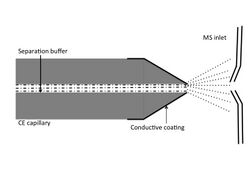 CE capillary is coupled directly to an electrospray ionization source with a sheathless interface system. The electric contact for ESI is realized by using capillary coated with conductive metal.[14] Because no sheath liquid is used, the system has high sensitivity, low flow rates and minimum background. However, these interface designs, all have challenges including low mechanical robustness, poor reproducibility.