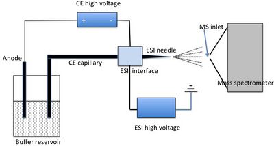 In the first CE–MS interface a stainless steel capillary sheath around the separation capillary terminus was used instead of terminus electrode in typical CE setup.[13] An electrical contact of stainless steel capillary with background electrolyte flowing out from the separation capillary was made at that point completing the circuit and initiating the electrospray. This interface system had few drawbacks like mismatch in the flow rates of two systems. Since then, interface system has been improved to have continuous flow rate and good electrical contact. Another key factor for successful CE–MS interface is the choice of buffer solution which must be suitable for both CE separation and ESI operation. At present, three types of interface system exist for CE/ESI-MS which are discussed briefly.