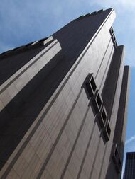 The Oldest House setting was based on brutalist architecture, a style utilizing large concrete blocks popularized in the 1950s and used in many government buildings at the time. The game's world design director, Stuart Macdonald, described brutalism as a good science-fiction setting, as it has "this sense of power, weight, strength and stability to it", and when the Oldest House's geometries are affected by the Hiss, "it makes for a really good contrast with the impossible architecture".[16] The relatively flat colors of the background walls made it an ideal canvas to showcase other design and lighting effects in the game. It served well into the telekinesis powers of the game, as the concrete walls would be used in lieu of a target object when the player throws debris at foes via telekinesis, and the initially pristine spaces end up showing the results of a large, destructive battle.[16] Among real-world influences in the game's architecture is 33 Thomas Street, formerly known as the AT&T Long Lines Building, a windowless building in the center of New York City. Macdonald used this building as a modern example of brutalism, and created the Oldest House as a "bizarre, brutalist monolith" to house the FBC.[16] Other real-world locations used as inspiration included the Boston City Hall, the Andrews Building at the University of Toronto Scarborough, and the Met Breuer.[16]