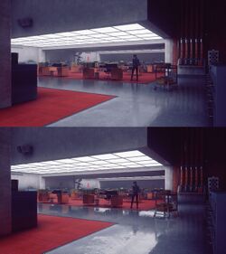 Other real-world architects inspired the game's structures. Carlo Scarpa's work was used heavily in designing stairways that ascended with other parts of the structure, while Tadao Ando's focus on lighting and spiritual spaces were reflected in other parts of the game.[16] Additionally, the design team turned to film for other inspiration. Films of Stanley Kubrick, particularly A Clockwork Orange, as well as films featuring oppressive government agencies, such as The Shape of Water, served as part of the design basis.[16] Other films, like Tinker Tailor Soldier Spy, evoke the concept of repetitiveness, process, and ritualism in these agencies, and that was used to define some of the internal artwork and architecture.[16] Art director Janne Pulkkinen stated they looked at real world churches and other places where ritualism is common, as lighting and design of those spaces are often used to draw attention to specific points of interest.[16]
