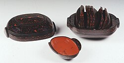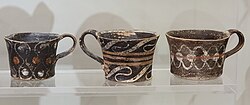 An ancient shape of cup in various parts of Eurasia was the "flanged cup" with either one or two flat horizontal strips attached to part of the top of the cup, acting as handles. These are found as grave goods in elite burials from around the Warring States Period (c. 475 to 221 BC), in Chinese lacquerware (wood coated with resin from a tree) with two flanges at the sides of an ovoid cup. These are also called "eared cups" (耳杯) and "winged goblets".[32] A form with a flange on only one side appears in ancient Persian silver, and then later in Chinese porcelain, apparently gradually developing into a shape for brush-washers on the calligrapher's desk.[33]