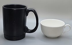 Many languages − including English, French, Italian, Polish, Russian, German − use two separate words for mugs and cups. Wierzbicka suggests that this situation is due to a slightly different functionality: the traditional cups are designed for drinking while sitting down at the table, while the mug is supposed to be used anywhere. This, in her opinion, explains all the specific features:[22]