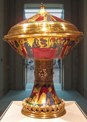The Royal Gold Cup is an exceptionally rare survival, made before 1391 for John, Duke of Berry, a French prince, who gave it to his uncle, Charles VI of France. It is in gold, decorated with jewels and scenes in enamel, with a cover and a boiled leather carrying case. It once had a triangular stand which has been lost. It weighs 1.935 kilos, so was perhaps used ceremonially rather than throughout meals.[42]