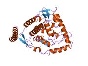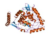Tyrosine hydroxylase is a tetramer of four identical subunits (homotetramer). Each subunit consists of three domains. At the carboxyl terminal of the peptide chain there's a short alpha helix domain that allows tetramerization.[11] The central ~300 amino acids make up a catalytic core, in which all the residues necessary for catalysis are located, along with a non-covalently bound iron atom.[8] The iron is held in place by two histidine residues and one glutamate residue, making it a non-heme, non-iron-sulfur iron-containing enzyme.[12] The amino terminal ~150 amino acids make up a regulatory domain, thought to control access of substrates to the active site.[13] In humans there are thought to be four different versions of this regulatory domain, and thus four versions of the enzyme, depending on alternative splicing,[14] though none of their structures have yet been properly determined.[15] It has been suggested that this domain might be an intrinsically unstructured protein, which has no clearly defined tertiary structure, but so far no evidence has been presented supporting this claim.[15] It has however been shown that the domain has a low occurrence of secondary structures, which doesn't weaken suspicions of it having a disordered overall structure.[16] As for the tetramerization and catalytic domains their structure was found with rat tyrosine hydroxylase using X-ray crystallography.[17][18] This has shown how its structure is very similar to that of phenylalanine hydroxylase and tryptophan hydroxylase; together the three make up a family of homologous aromatic amino acid hydroxylases.[19][20]