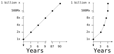 In 1996, Yudkowsky predicted a singularity by 2021.[20] His version of singularity involves intelligence explosion: once AIs are doing the research to improve themselves, speed doubles after 2 years, then 1 one year, then after 6 months, then after 3 months, then after 1.5 months, and after more iterations, the "singularity" is reached.[20] This construction implies that the speed reaches infinity in finite time.