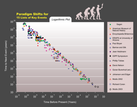 In addition to general criticisms of the singularity concept, several critics have raised issues with Kurzweil's iconic chart. One line of criticism is that a log-log chart of this nature is inherently biased toward a straight-line result. Others identify selection bias in the points that Kurzweil chooses to use. For example, biologist PZ Myers points out that many of the early evolutionary "events" were picked arbitrarily.[83] Kurzweil has rebutted this by charting evolutionary events from 15 neutral sources, and showing that they fit a straight line on a log-log chart. Kelly (2006) argues that the way the Kurzweil chart is constructed with x-axis having time before present, it always points to the singularity being "now", for any date on which one would construct such a chart, and shows this visually on Kurzweil's chart.[84]