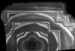 Using probes such as polarized light, photoluminescence, and cathodoluminescence, a series of growth zones can be identified in diamonds. The characteristic pattern in diamonds from the lithosphere involves a nearly concentric series of zones with very thin oscillations in luminescence and alternating episodes where the carbon is resorbed by the fluid and then grown again. Diamonds from below the lithosphere have a more irregular, almost polycrystalline texture, reflecting the higher temperatures and pressures as well as the transport of the diamonds by convection.[66]