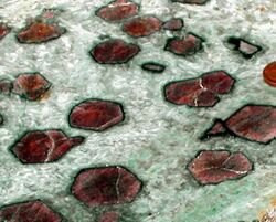 Kimberlites can be found in narrow (1 to 4 meters) dikes and sills, and in pipes with diameters that range from about 75 m to 1.5 km. Fresh rock is dark bluish green to greenish gray, but after exposure rapidly turns brown and crumbles.[73] It is hybrid rock with a chaotic mixture of small minerals and rock fragments (clasts) up to the size of watermelons. They are a mixture of xenocrysts and xenoliths (minerals and rocks carried up from the lower crust and mantle), pieces of surface rock, altered minerals such as serpentine, and new minerals that crystallized during the eruption. The texture varies with depth. The composition forms a continuum with carbonatites, but the latter have too much oxygen for carbon to exist in a pure form. Instead, it is locked up in the mineral calcite (CaCO3).[66]