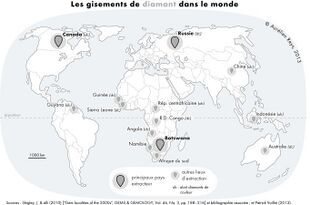 Diamond extraction from primary deposits (kimberlites and lamproites) started in the 1870s after the discovery of the Diamond Fields in South Africa.[134] Production has increased over time and now an accumulated total of 4,500,000,000 carats (900,000 kg) have been mined since that date.[135] Twenty percent of that amount has been mined in the last five years, and during the last 10 years, nine new mines have started production; four more are waiting to be opened soon. Most of these mines are located in Canada, Zimbabwe, Angola, and one in Russia.[135]