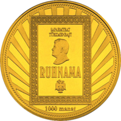 Also, like any good despot, Niyazov wrote a really shitty book and then ordered people to read it. His magnum opus, the Ruhnama, was extra shitty, with stream-of-consciousness-writing, random reminders to wear clean clothes, and the bizarre claim that the Turkmen nation was descended from Noah.[28] He had his people treat it like the damn Bible, carving its title on mountains and having TV programs sign off with readings from the book. Oh, and he naturally had a giant statue built of the book.[29]