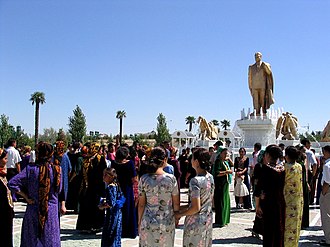 The Republic of Turkmenistan is one of the former Soviet constituent republics. Out of all of the former Soviet republics, it is the most corrupt and least democratic, ranking right below Tajikistan. It's perhaps most notable for the famously crazy personality cult built around its first dictator, President for Life Saparmurat Niyazov, who ruled until he died in 2006. Niyazov renamed whole months after himself and his family members, built a golden statue of himself that rotates to face the sun, and required students to learn and take spiritual guidance from his evidently stultifying stream-of-consciousness book Rukhnama. One reviewer wrote, "On a lark, I decided to read through some of this book. It was absolutely painful. It is filled with such flaccid ghost-written text that it makes Leviticus seem like an action thriller." The reviewer goes on to say he would need a gun held to his head to motivate him to read any more of it; ironically, that was a common practice in Turkmenistan.[2][3] After Niyazov's death, he was succeeded by Gurbanguly Berdimuhamedow, his personal dentist.[4] Berdimuhamedow continued his mentor's tradition of turning Turkmenistan into an international joke. In 2019, for instance, he attracted ridicule for filming a video where he taught his government ministers how to exercise.[5] Amazing. The Turkmen clown show is run from Ashgabat, its capital and largest city. The vast majority of its oppressed population are Turkmen Turks who follow Islam.