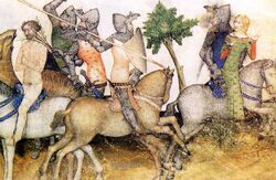 The upper class or nobility, represented chiefly by the Knight and his Squire, was in Chaucer's time steeped in a culture of chivalry and courtliness. Nobles were expected to be powerful warriors who could be ruthless on the battlefield yet mannerly in the King's Court and Christian in their actions.[54] Knights were expected to form a strong social bond with the men who fought alongside them, but an even stronger bond with a woman whom they idealised to strengthen their fighting ability.[55] Though the aim of chivalry was to noble action, its conflicting values often degenerated into violence. Church leaders frequently tried to place restrictions on jousts and tournaments, which at times ended in the death of the loser. The Knight's Tale shows how the brotherly love of two fellow knights turns into a deadly feud at the sight of a woman whom both idealise. To win her, both are willing to fight to the death. Chivalry was on the decline in Chaucer's day, and it is possible that The Knight's Tale was intended to show its flaws, although this is disputed.[56] Chaucer himself had fought in the Hundred Years' War under Edward III, who heavily emphasised chivalry during his reign.[57] Two tales, Sir Topas and The Tale of Melibee are told by Chaucer himself, who is travelling with the pilgrims in his own story. Both tales seem to focus on the ill-effects of chivalry—the first making fun of chivalric rules and the second warning against violence.[58]