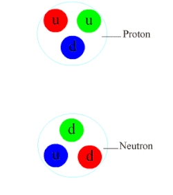 Fundamentally, baryonic matter is made of quarks that bind together to form more familiar particles, such as protons and neutrons. Quarks, like protons, have an electric charge, but enjoy the additional privilege of a color charge. One can think of the color charge as analogous to electric charge, but instead of two possible charges (positive and negative) it has three: red, green, and blue. The color charge of a quark determines how the strong nuclear force acts on it.