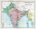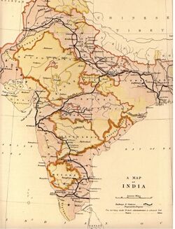 ![]() Political subdivisions of the British Raj, commonly India, in 1909, showing British India in two shades of pink and the Princely states in yellow | |||||||||||||||||||||||