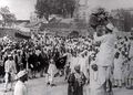 Hindus and Muslims, with flags of Indian National Congress and the Muslim League, collecting clothes to be burnt as a part of the non-cooperation movement