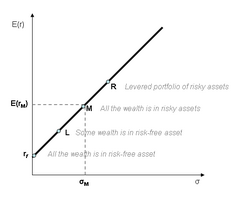 In general, then, while portfolio theory studies how investors should balance risk and return when investing in many assets or securities, the CAPM is more focused, describing how, in equilibrium, markets set the prices of assets in relation to how risky they are. [note 9] This result will be independent of the investor's level of risk aversion and assumed utility function, thus providing a readily determined discount rate for corporate finance decision makers as above,[31] and for other investors. The argument proceeds as follows: If one can construct an efficient frontier – i.e. each combination of assets offering the best possible expected level of return for its level of risk, see diagram – then mean-variance efficient portfolios can be formed simply as a combination of holdings of the risk-free asset and the "market portfolio" (the Mutual fund separation theorem), with the combinations here plotting as the capital market line, or CML. Then, given this CML, the required return on a risky security will be independent of the investor's utility function, and solely determined by its covariance ("beta") with aggregate, i.e. market, risk. This is because investors here can then maximize utility through leverage as opposed to pricing; see Separation property, Markowitz model § Choosing the best portfolio and CML diagram aside. As can be seen in the formula aside, this result is consistent with the preceding, equaling the riskless return plus an adjustment for risk.[5] A more modern, direct, derivation is as described at the bottom of this section; which can be generalized to derive other equilibrium-pricing models.