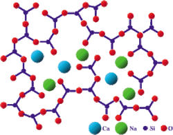 Bioglass 45S5, commonly referred to by its commercial name Bioglass, is a glass specifically composed of 45 wt% SiO2, 24.5 wt% CaO, 24.5 wt% Na2O, and 6.0 wt% P2O5.[1] Glasses are non-crystalline amorphous solids that are commonly composed of silica-based materials with other minor additives. Compared to soda-lime glass (commonly used, as in windows or bottles), Bioglass 45S5 contains less silica and higher amounts of calcium and phosphorus. The 45S5 name signifies glass with 45 weight % of SiO2 and 5:1 molar ratio of calcium to phosphorus. This high ratio of calcium to phosphorus promotes formation of apatite crystals; calcium and silica ions can act as crystallization nuclei.[2] Lower Ca:P ratios do not bond to bone.[3] Bioglass 45S5's specific composition is optimal in biomedical applications because of its similar composition to that of hydroxyapatite, the mineral component of bone. This similarity provides Bioglass' ability to be integrated with living bone.