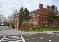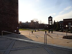 The university's first permanent campus was at the former farm of Azariah Boody.[80] While a number of buildings still stand including Anderson Hall, the Eastman Laboratories, and a number of student dormitories, these buildings have been absorbed by private companies or the Rochester School of the Arts. The university retains control of a few acres of land including the land under the Sibley Library (razed), old campus gates, the Memorial Art Gallery's old and new wings, and the Cutler Union, a prime example of the Collegiate Gothic style of 20th-century architecture.