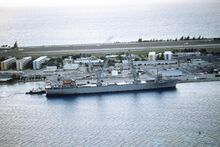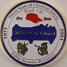 A May 1975 letter to a member of the 267th Chemical Company from his Commander notes that the primary mission on Johnston Island consisted of maintaining a forty-one acre chemical munitions storage area, called Red Hat, having forty-three storage structures containing about 13,000 tons of munitions.[7] A Johnston Atoll orientation packet from the same time period explains that the mission of the 267th Chemical Company, noted to also be known as "Red Hat," was to provide for the storage, maintenance, security, issuance, and surveillance of chemical munitions.[7] In 1976 the company came under the 45th General Support Group.