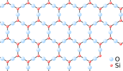 In amorphous silica (fused quartz), the SiO4 tetrahedra form a network that does not exhibit any long-range order. However, the tetrahedra themselves represent a high degree of local ordering, i.e. every silicon atom is coordinated by 4 oxygen atoms and the nearest neighbour Si-O bond length exhibits only a narrow distribution throughout the structure.[6] If one considers the atomic network of silica as a mechanical truss, this structure is isostatic, in the sense that the number of constraints acting between the atoms equals the number of degrees of freedom of the latter. According to the rigidity theory, this allows this material to show a great forming ability.[25] Despite the lack of ordering on extended length scales, the tetrahedra also form a network of ring-like structures which lead to ordering on intermediate length scales (up to approximately 10 angstroms or so).[6] Under the application of high pressure (approximately 40 GPa) silica glass undergoes a continuous polyamorphic phase transition into an octahedral form, i.e. the Si atoms are surrounded by 6 oxygen atoms instead of four in the ambient pressure tetrahedral glass.[26]