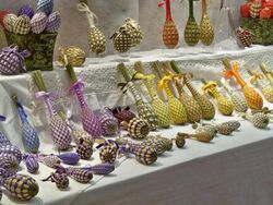 Flower spikes are used for dried flower arrangements. The fragrant, pale purple flowers and flower buds are used in potpourris. Lavender is also used as herbal filler inside sachets used to freshen linens. Dried and sealed in pouches, lavender flowers are placed among stored items of clothing to give a fresh fragrance and to deter moths.[32] Dried lavender flowers may be used for wedding confetti. Lavender is also used in scented waters and sachets.