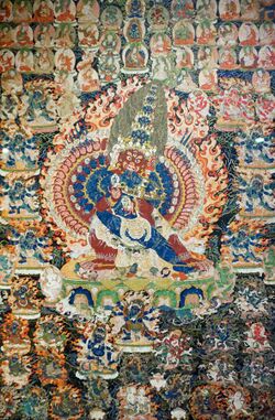This practice is found in most of the major Unsurpassed Yoga Tantras and in numerous systems like the Six Yogas of Naropa, Lamdre, and Anuyoga. In this practice, one first causes the winds to enter into the central channel as practiced in tummo and then joins in union with a consort (actual or imaged). This causes the vital winds to enter, dwell and dissolve in the central channel simultaneously, causing great bliss and the "four joys" which allows one to access pristine awareness.[74] All Tibetan traditions agree that qualified lay practitioners (including former monks) can use physical consorts as the Indian mahasiddhas ("great adepts") did. For example, Atisa wrote that "those (consecrations) on which the householder may rely include everything taught in the tantras."[76] There are different stances on whether current monks can engage in the practice. The Buddhist scholar Tripitakamala felt the overall goal of Buddhahood overrides concerns for monastic vows.[77]