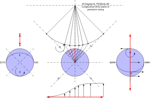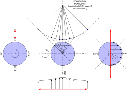 For the equatorial pendulum with a swing in the longitudinal (north-south) direction the surface velocity vectors on either side of the swing are balanced in the same direction and the center-point of the pendulum swing is moving along with the direction of rotation (see Figure 2A).