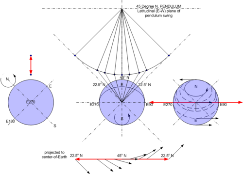 For the 45° North pendulum with latitudinal swing (Figure 3B) the support point of the pendulum swing is moving along with the direction of rotation and the surface velocity vectors on either side of the swing are not balanced. The rotation of the Earth is observable in relation to the pendulum swing because a change in relationship to the surface occurs. On one side of the pendulum swing the surface velocity vectors are angled upwards and to the side but on the other side the vectors are angled downwards and to the opposite side. Since these vectors are not all in the same plane as the pendulum swing and are not balanced in the same direction there is a change in relationship between the surface and the plane of the pendulum swing.