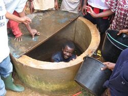 Drawbacks to hand-dug wells are numerous. It can be impractical to hand dig wells in areas where hard rock is present, and they can be time-consuming to dig and line even in favourable areas. Because they exploit shallow aquifers, the well may be susceptible to yield fluctuations and possible contamination from surface water, including sewage. Hand dug well construction generally requires the use of a well trained construction team, and the capital investment for equipment such as concrete ring moulds, heavy lifting equipment, well shaft formwork, motorized de-watering pumps, and fuel can be large for people in developing countries. Construction of hand dug wells can be dangerous due to collapse of the well bore, falling objects and asphyxiation, including from dewatering pump exhaust fumes.