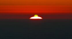 All optical phenomena coincide with quantum phenomena.[1] Common optical phenomena are often due to the interaction of light from the Sun or Moon with the atmosphere, clouds, water, dust, and other particulates. One common example is the rainbow, when light from the Sun is reflected and refracted by water droplets. Some phenomena, such as the green ray, are so rare they are sometimes thought to be mythical.[2] Others, such as Fata Morganas, are commonplace in favored locations.