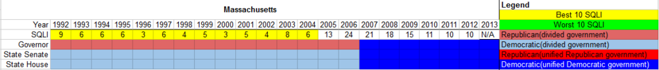 The chart below depicts the partisanship of the Massachusetts state government and the state's SQLI ranking for the years studied. For the SQLI, the states were ranked from 1-50, with 1 being the best and 50 the worst. Massachusetts had a period of divided government between 1992 and 2006 before electing a Democratic trifecta in 2007. Between the years 1992 and 2004, Massachusetts remained in the top-10 in the SQLI ranking, hitting its highest spot (3rd) in 2000 under divided government. The state had its lowest ranking (24th) in 2006, also under divided government. During the years 2005 and 2006, Massachusetts fell eleven spots in the SQLI ranking under divided government, which was its largest drop in the ranking during the period of the study. The state has never had a Republican trifecta.