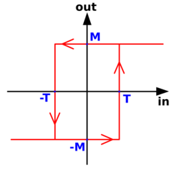 A Schmitt trigger is a simple electronic circuit that exhibits this property.