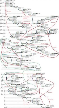 In the image of parse thicket coreferences and entity-entity links are shown in solid red, and rhetoric/speech act relations are shown in dotted red. ETAP parser and tree visualization software is used.[4]