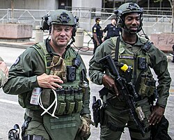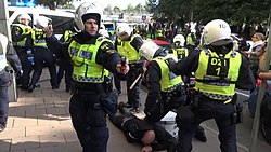 Almost universally, police officers are authorized to use force, up to and including deadly force, when acting in a law enforcement capacity.[17] Although most law enforcement agencies follow some variant of the use of force continuum, where officers are only authorized to use the level of force required to match situational requirements, specific thresholds and responses vary between jurisdictions.[18] While officers are trained to avoid excessive use of force, and may be held legally accountable for infractions, the variability of law enforcement and its dependence on human judgment have made the subject an area of controversy and research.[19][20]