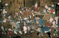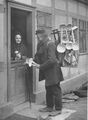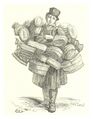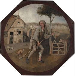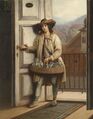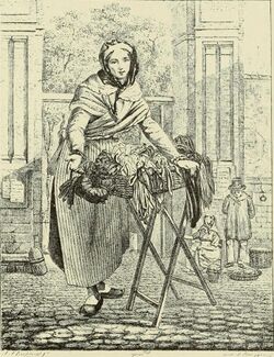 The Wayfarer by Hieronymous Bosch is perhaps the most iconic image of a peddler. Painted in about 1500, the peddler in this painting wears a costume almost identical to thieves in other Bosch paintings.[31] From the 18th-century, engravings featuring peddlers and street vendors featured in numerous volumes dedicated to representations of street life.[32] One of the first of such publications was a French publication, Etudes Prises Dans let Bas Peuple, Ou Les Cris de Paris (1737) (roughly translated as Studies Taken of the Lower People, Or The Cries of Paris).[33] In 1757, the first English publication in this genre was The Cries of London Calculated to Entertain the Minds of Old and Young; illustrated in variety of copper plates neatly engrav'd with an emblematical description of each subject, was published.[34] and followed by Cries of London (1775)[35] These were followed by numerous illustrated works which continued into the 20th century.