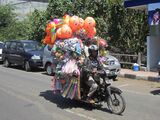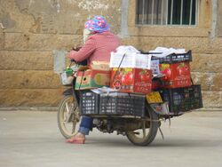 Today, peddlers continue to travel by foot, but also use bicycle, hand-held carts, horse-drawn carts or drays and motorized vehicles such as motor-bikes as transport modes. To carry their wares, peddlers use purpose-built back-packs, barrows, hand-carts or improvised carrying baskets. Rickshaw peddlers are a relatively common sight across Asia.