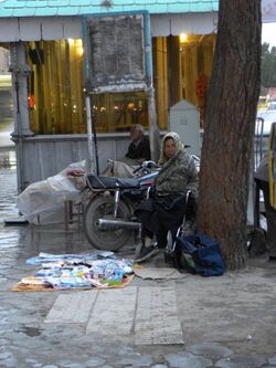 A peddler, under English law, is defined as: "any hawker, pedlar, petty chapman, tinker, caster of metals, mender of chairs, or other person who, without any horse or other beast bearing or drawing burden, travels and trades on foot and goes from town to town or to other men's houses, carrying to sell or exposing for sale any goods, wares, or merchandise immediately to be delivered, or selling or offering for sale his skill in handicraft."[4][5] The main distinction between peddlers and other types of street vendor is that peddlers travel as they trade, rather than travel to a fixed place of trade. Peddlers travel around and approach potential customers directly whereas street traders set up a pitch or a stall and wait for customers to approach them. When not actually engaged in selling, peddlers are required to keep moving. Although peddlers may stop to make a sale, they are precluded from setting up a pitch or remaining in the same place for lengthy periods. Although peddlers normally travel by foot, there is no reason why they cannot use some means of assistance, such as a cart or a trolley, to assist in the transportation of goods.