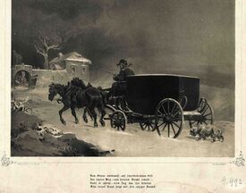 The night of Mozart's death was dark and stormy; at the funeral, too, it began to rage and storm. Rain and snow fell at the same time, as if Nature wanted to shew her anger with the great composer's contemporaries, who had turned out extremely sparsely for his burial. Only a few friends and three women accompanied the corpse. Mozart's wife was not present. These few people with their umbrellas stood round the bier, which then taken via the Grosse Schullerstrasse to the St. Marx Cemetery. As the storm grew ever more violent, even these few friends determined to turn back at the Stuben Gate, and they betook themselves to the "Silver Snake". Deiner, the landlord, was also present for the funeral.[29]