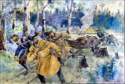 Rather than hunting the marine life themselves, the Sibero-Russian promyshlenniki forced the Aleuts to do the work for them, often by taking hostage family-members in exchange for hunted seal-furs.[10] This pattern of colonial exploitation resembled some of the promyshlenniki practices in their expansion into Siberia and the Russian Far East.[11] As word spread of the potential riches in furs, competition among Russian companies increased and a large number of Aleuts were apparently enserfed.[12][10][13][14]