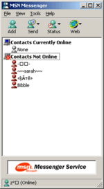 Before the product was renamed Windows Live Messenger, it was named "MSN Messenger" from 1999 to 2006. During that time, Microsoft released seven major versions as follows. The first version of MSN Messenger Service, version 1.0 (1.0.0863), was released July 22, 1999. It included only basic features, such as plain text messaging and a simplistic contact list.[7] When it was first released, it featured support for access to America Online's AIM network. America Online continually tried to block Microsoft from having access to their service until eventually the feature was removed, and it has not re-surfaced in any later versions of the software.[8] AOL did this by exploiting a buffer overflow bug in AIM, which causes it to execute a bit of machine code sent by the server. When this code runs, it determines if the client is AIM and sends a message back to verify the client.[9] Since then, the software has only allowed connections to its own service, requiring a Windows Live ID (.NET Passport at that time) account to connect. Microsoft released the first major update, version 2.0 (2.0.0083), on November 16, 1999. It included a rotating advertising banner and the ability to customize the appearance of the chat window. It came as an install option for Windows Me. This version was followed the next year by version 3.0 (3.0.0080), which was released May 29, 2000. It included file transfers and PC-to-PC and PC-to-phone audio capabilities with Net2Phone and Callserve,[10] two of the larger VoIP providers.[11]