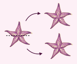 In asexual starfish reproduction, starfish develop offspring identical to the parent. This can be achieved through arm autotomy or fission. In arm autotomy, starfish typically shed arms with part of the central disk attached. This arm regenerates into a full starfish identical to the original through disk-dependent bidirectional regeneration. In some species, disk independent bidirectional regeneration is utilized to produce new starfish. Several species also produce larvae that are capable of asexual reproduction prior to adulthood through autotomy and budding.[33]