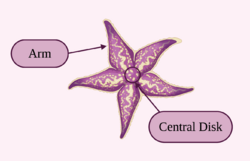 The typical starfish has five or more arms, or “rays”, radiating from a central disk.[4] Each arm contains a copy of vital organs and is equipped with eyespots, an eye-like structure that helps the starfish differentiate between light and darkness,[5] and tube feet, which enable locomotion.[6] All organs connect to the digestive system in the central disk, which also contains the starfish mouth and stomach.[5] This replication and delocalization of vital organs makes starfish especially resilient to the loss of appendages. Following injury or amputation, a star fish can survive with its remaining organ copies during the period of regeneration, which ranges from a few months to over a year.[2]