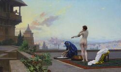 Along with Eve, Bathsheba was almost the only female whose nude depiction could easily and regularly be justified in Christian art, and she is therefore an important figure in the development of the nude in medieval art. Though sometimes shown clothed at other points in her story, the most common depiction, in both medieval and later art, was Bathsheba at her Bath, the formal name for the subject in art showing Bathsheba bathing, watched by King David. This could be shown with various degrees of nudity, depending on the pose and the placing of clothes or towels. One of the most common placements in the 15th century, perhaps surprisingly, was in miniatures illustrating a book of hours, a personal prayer book, that overtook the psalter as the most popular devotional book for laypeople. This was especially the case in France.[37]