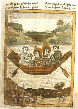 The current German name of Bodensee derives from the place name Bodman, which probably originally derived from the Old High German bodamon which meant "on the soils", indicating a place on level terrain by the lake.[9]: 500 This place, situated at the west end of Lake Überlingen (Überlinger See), had a more supraregional character for a certain period in the early Middle Ages as a Frankish imperial palace (Königspfalz), Alamannian ducal seat and mint, which is why the name may have been transferred to the lake ("lake, by which Bodman is situated" = Bodmansee). From 833 or 834, in Latin sources, the name appears in its Latinised form lacus potamicus.[10] Therefore, the name actually derived from the Bodman Pfalz (Latinized as Potamum) was wrongly assumed by monastic scholars like Walahfrid Strabo to be derived from the Greek word potamos for "river" and meant "river lake". They may also have been influenced by the fact that the Rhine flowed through the lake.[9]: 501ff