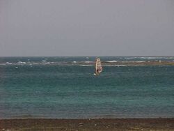 Sites of interest include Corralejo and El Jable to the north which are made up of fine sand dunes whilst the south is filled with long beaches and remote bays. The constant winds blowing onto the beaches provide a paradise for windsurfing. Surfing is common on the west and north coasts where there are large waves. Windsurfing is common around Corralejo and Playas de Sotavento and wave sailing (windsurfing on the waves) on the coast along the northern half of the island. El Cotillo is a small fishing village in the north-west of the Island famous for a very long beach to the south of the village and few very calm beaches to the north. The northern beaches frequented by snorkeling enthusiasts and sun worshippers alike are referred to as lakes by the locals.