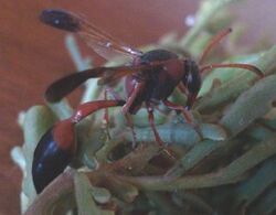 Despite its arid climate, the island is also home to a surprisingly large insect fauna. Butterflies which commonly occur on the island include the clouded yellow (Colias hyale) and the bath white (Pontia daplidice) which feeds on xerophytic cruciferae. The island is also home to the monarch butterfly (Danaus plexippus) and its close African relative Danaus chrysippus. Around holiday developments such as Caleta de Fuste, water is relatively abundant, and dragonfly species including the blue emperor (Anax imperator) and the scarlet darter (Crocothemis erythraea) can be found. The island's sand dunes and shoreline are home to a number of bee and wasp species including the large eumenid caterpillar hunting wasp, Delta dimidiatipenne and the blue banded bee (Amegilla canifrons).