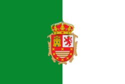 The flag of Fuerteventura is in proportions 1:2, divided vertically, green to the hoist and white to the fly end, with the coat of arms of the island in the centre.