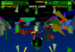 The main objective of the game is to retrieve data pods while facing a variety of enemies to remove existing virus programs in each of the 21 levels.[1][2][6][7][8] The player can choose between three different types of tanks, each with their own advantages and disadvantages.[1][3][7] Most levels feature traps and manipulable switches that activate devices like doors, jump pads, and teleporters.[3][5][6][8] The levels are sorted into closed rooms connected via teleporters.[3] The player can also explore each level to uncover items and weapon power-ups.[5][7][8] After retrieving a pre-determined number of data pods, an exit will open and the player proceeds to the next level.[3][5][6] Between levels there are bonus rounds in which the player are tasked with collecting a set percentage of data pods to gain an extra life.[6][7][8]